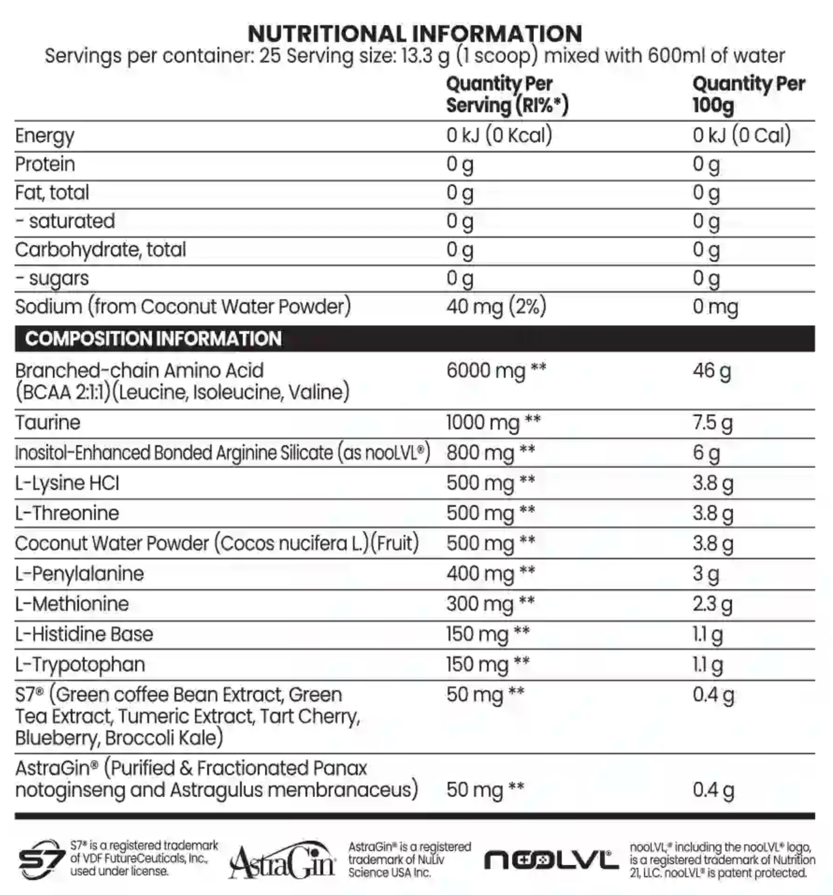 But Pumping Aminos doesn’t stop there. We’ve also included powerful muscle pump ingredients such as nooLVL® (inositol-enhanced Bonded Arginine Silicate) and Raw Coconut Water Powder to enhance blood flow, improve nutrient delivery, and give you that coveted muscle pump during your workouts.