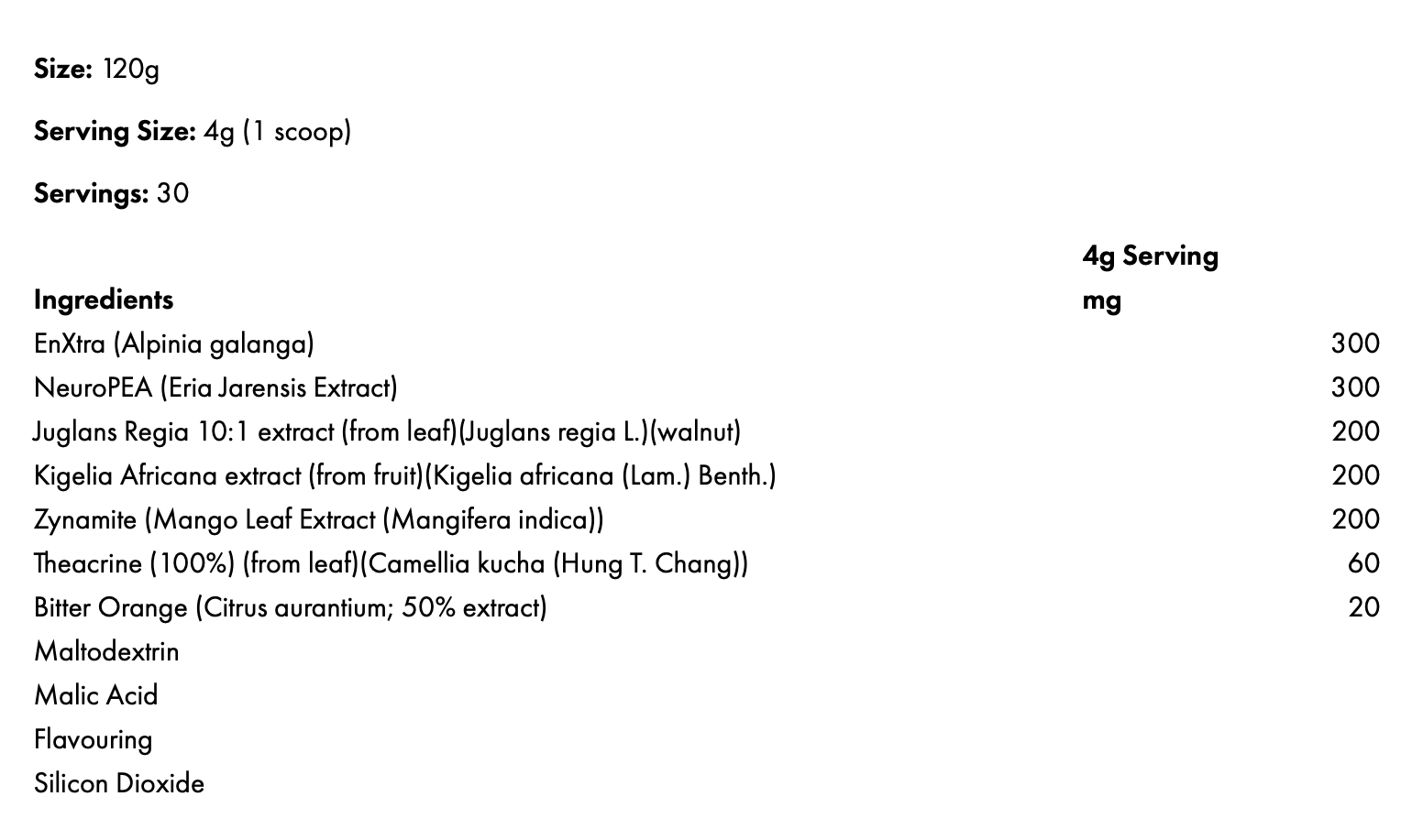 Formulated by Dr Dean St Mart PhD using 300mg enXtra, 300mg NeuroPEA, 200mg Juglans Regia extract, 200mg Kigella African extract, 200mg Zynamite, 60mg Theacrine, and 20mg Citrus Aurantium (50% extract)